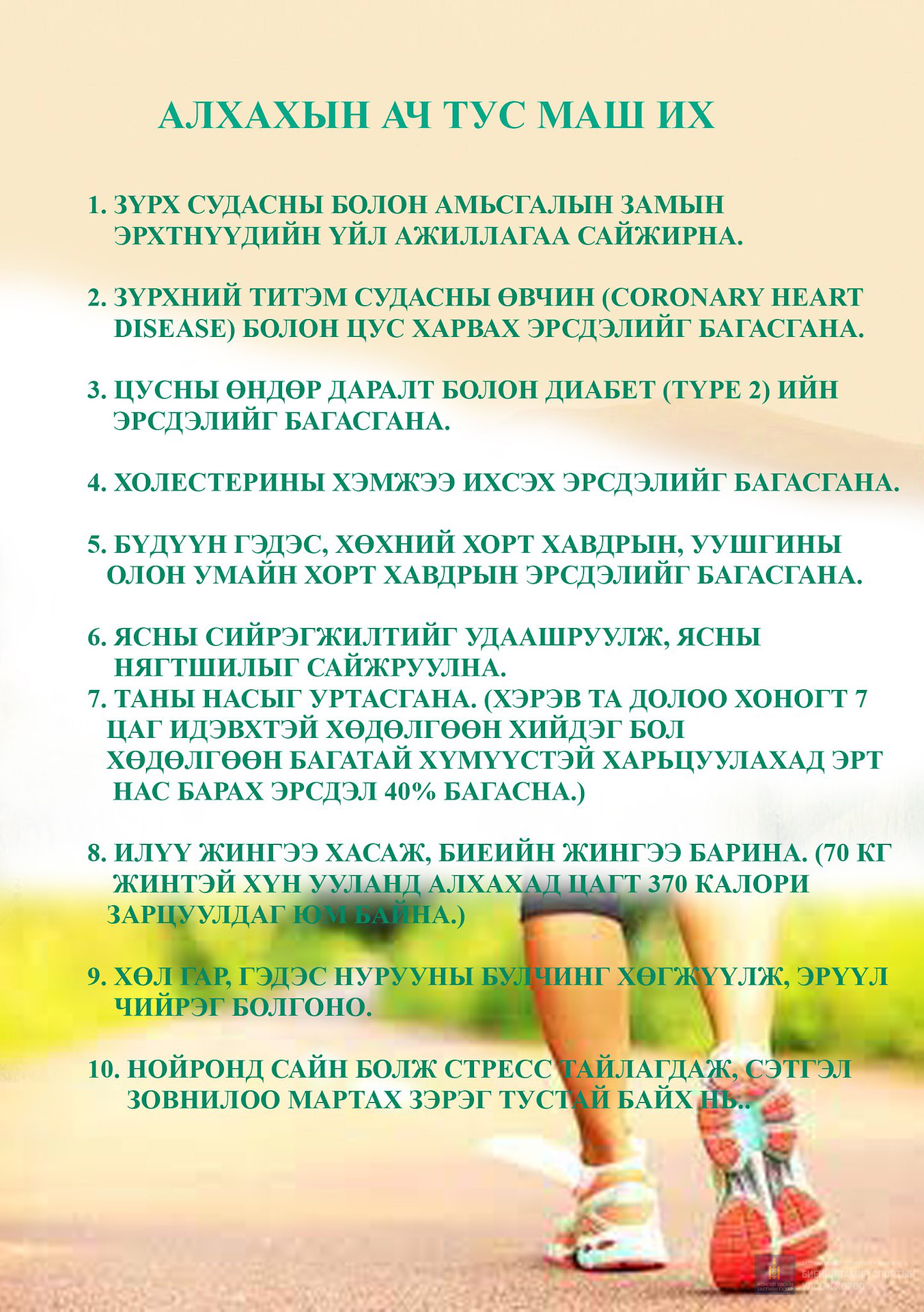 Эрүүл монгол хүн үндэсний хөдөлгөөнийг эрчимжүүлэх, идэвхтэй хөдөлгөөнөөр хичээллэх иргэдийн тоог нэмэгдүүлэх зорилгоор 2025 оны 04 дүгээр сарын 04-ний өдөр "Идэвхтэй иргэн-Эрүүл Төв аймаг" арга хэмжээний хүрээнд өглөөний алхалт тогтмол хийдэг 50 гаруй иргэдэд явган алхалтын танилцуулах материалыг тарааж, витамин уух зүйлээр үйлчилгээ үзүүллээ.